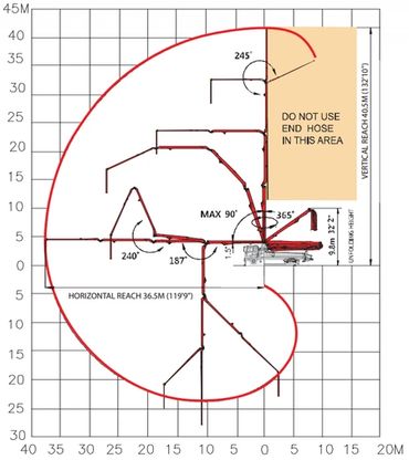 We operate a fleet of late model, Alliance Concrete pumps. With boom pumps ranging from 20 through 41 meters, we are sure to have a pump that will meet your needs. All our equipment is certified as per WCB regulations, and is serviced and maintained by our qualified technicians to ensure maximum reliability and up time. We do our best to give you on time and trouble free service! Scroll down to see the various dimensions and outrigger displacements for each of our boom sizes. Feel free to call with any questions or concerns.